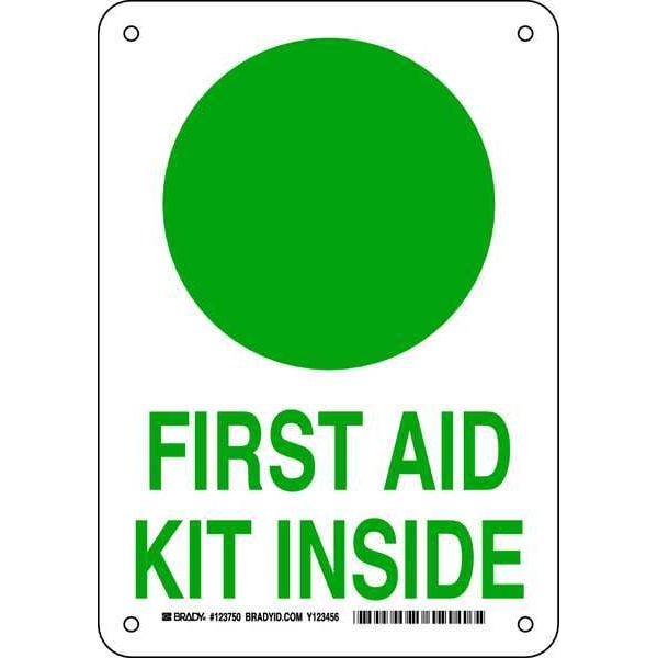 Facility Sign, Sign Subject Matter First Aid, Height 10 In., Width 7 In., Sign Material Plastic, Sign Mounting Style With Mounting Holes, Header No Header, Legend First Aid Kit Inside, Printed Language English, Sign Shape Rectangle