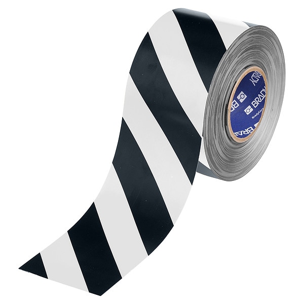 Floor Marking Tape, Continuous Roll, Striped, Black/White, 4 in, 100 ft, Not Applicable, 22 mil, Polyester, Brady(R), ToughStripe(R) Max, Series B-553, Glow In The Dark No, Retroreflective Grade Non-Reflective, Tape Finish Gloss, Tape Core Diameter 3 in