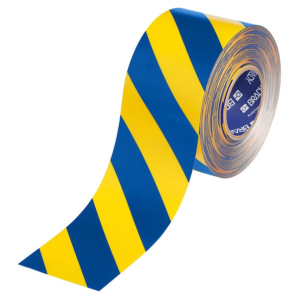 Floor Marking Tape, Continuous Roll, Striped, Blue/Yellow, 4 in, 100 ft, Not Applicable, 22 mil, Polyester, Brady(R), ToughStripe(R) Max, Series B-553, Glow In The Dark No, Retroreflective Grade Non-Reflective, Tape Finish Gloss, Tape Core Diameter 3 in