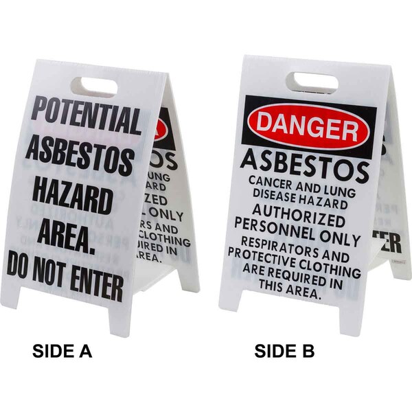 Floor Stand Sign, Sign Subject Matter Health Hazard, Height 20 in, Width 12 in, Sign Material Plastic, Sign Mounting Style Free-Standing Floor, Header No Header, Legend Potential Asbestos Hazard Area. Do Not Enter, Printed Language English, Sign Shape Rectangle