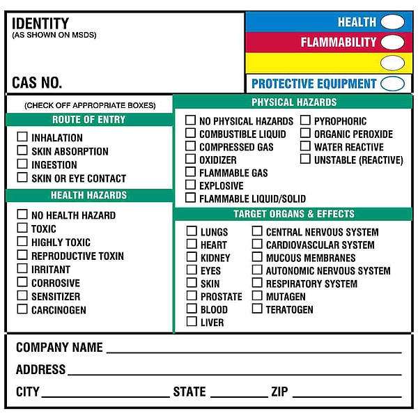 Right-To-Know Label, Adhesive Adhesive, Adhesive Material Acrylic, Adhesive Properties Permanent Adhesive, Background Color White, Hazard Communication Standard HMIG, Height 5 in, Kit Contents Not Applicable, Lamination Type Not Laminated, Language English, Material Paper, Material Properties Not Applicable, Maximum Service Temperature 149 Degrees F, Minimum Service Temperature -40 Degrees F, Mounting Type Adhesive, Package Type Pack