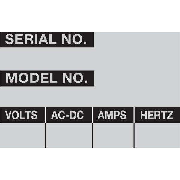 Inventory Label, Adhesive Adhesive, Adhesive Material Acrylic, Adhesive Type Permanent Adhesive, Indoor/Outdoor Usage Indoor, Label Color Silver, Label Diameter Not Applicable, Label Height 1 1/2 in, Label Material Aluminum, Label Shape Rectangle, Label Width 2 1/4 in, Language English, Number of Labels 150, Package Type Sheet, Preprinted Images Black Header Stripe, Preprinted Text AC-DC, Amps, Hertz, Model No., Serial No., Volts, Product Type Inventory Label, Label Finish Matte