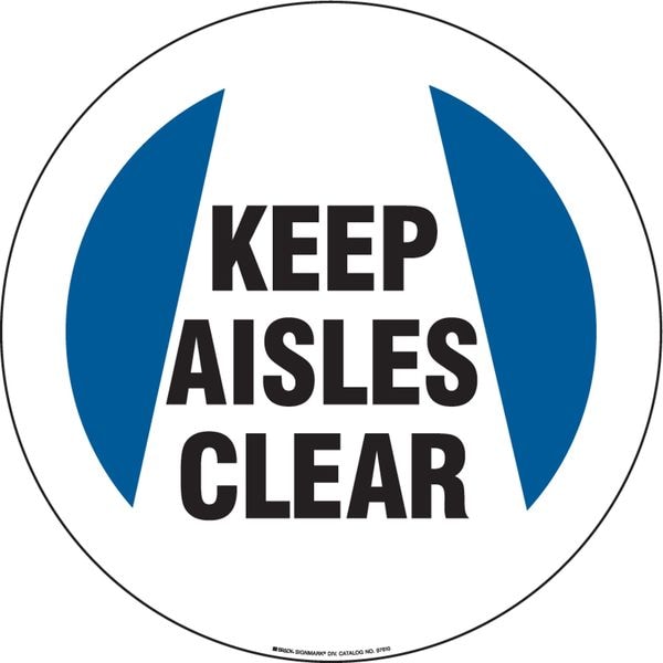 Housekeeping Sign, Sign Subject Matter Keep Clear, Height 17 In., Width 17 In., Sign Material Vinyl, Sign Mounting Style Adhesive Surface, Header No Header, Legend Keep Aisles Clear, Printed Language English, Sign Shape Circle