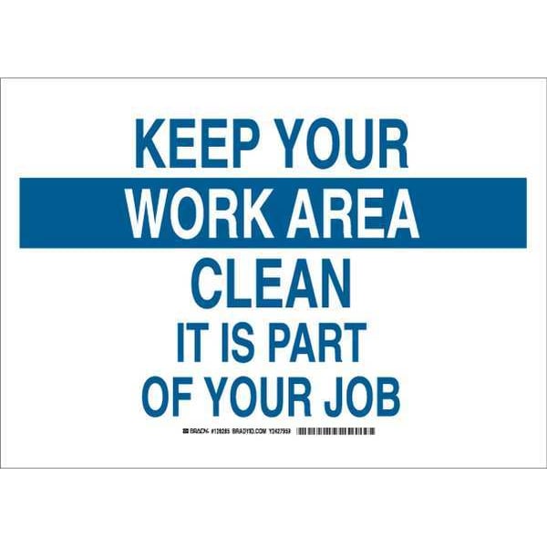 Facility Sign, Sign Subject Matter Cleaning and Maintenance, Height 10 In., Width 14 In., Sign Material Polyester, Sign Mounting Style Adhesive Surface, Header No Header, Legend Keep Your Work Area Clean It Is Part Of Your Job, Printed Language English, Sign Shape Rectangle