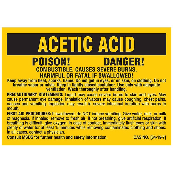 Label, Acetic Acid, Polyester, 2 7/8 in W, 2 in H