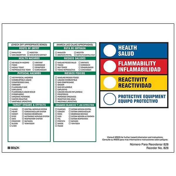 Right-To-Know Label, Adhesive Adhesive, Adhesive Material Not Applicable, Adhesive Properties Permanent Adhesive, Background Color White, Hazard Communication Standard HMIG, Height 8 in, Kit Contents Not Applicable, Lamination Type Not Laminated, Language English, Material Paper, Material Properties Not Applicable, Maximum Service Temperature 149 Degrees F, Minimum Service Temperature -40 Degrees F, Mounting Type Adhesive