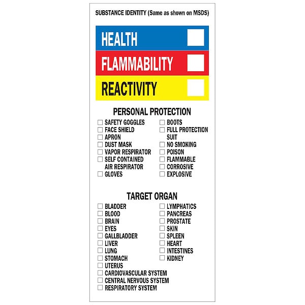 NFPA Label, Adhesive Adhesive, Adhesive Material Acrylic, Adhesive Properties Permanent Adhesive, Background Color White, Hazard Communication Standard NFPA, Height 8 in, Kit Contents Not Applicable, Lamination Type Not Laminated, Language English, Material Paper, Material Properties Not Applicable, Maximum Service Temperature 149 Degrees F, Minimum Service Temperature -40 Degrees F, Mounting Type Adhesive, Package Type Roll, Preprinted Text Health Flammability Reactivity