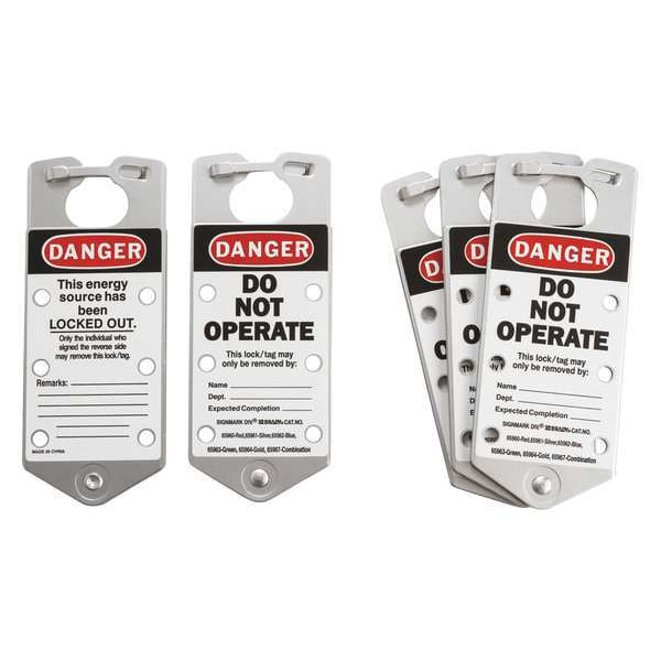 Labeled Lockout Hasp, Closed Jaw Hole Size 1 429/1000 in, For Maximum Padlock Shackle Diameter 5/16 in, Hasp Closure Type Snap In With Interlocking Tabs, Lockout Material Aluminum, Lockout Material Finish Anodized, Maximum Number of Padlocks 6, Product Type Labeled Hasp, Resistance Properties Chemical Resistant, Hasp Style Standard, Header Danger, Includes Write-On Area, Language English, Legend Danger Do Not Operate, Lockout Color Silver, Maximum Temperature 350 Degrees F