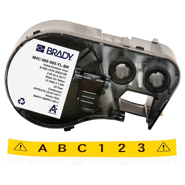 Combined Label and Ribbon Cartridge, Compatible Grainger Part Number 20XX01, 20XX02, 20XX04, 21U174, 21U176, 21U177, 21U178, 21U179, 21U180, 29YJ26, 810HX3, 810HX4, Compatible Mfr Part Number BMP41, BMP51, BMP53, M511, Label Color Yellow, Label Finish Gloss, Label Height Not Applicable, Label Material Vinyl, Label Width 1/2 in, Material Properties Autoclavable, Printer Series Compatibility BMP41, BMP51, BMP53, M410, M510, M511, Ribbon Color Black, Roll Length 25 ft, Vial/Tube Size Not Applicable