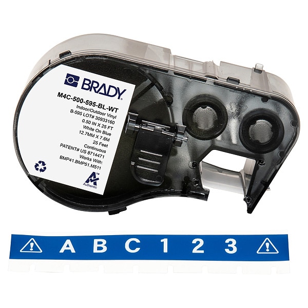 Combined Label and Ribbon Cartridge, Compatible Grainger Part Number 20XX01, 20XX02, 20XX04, 21U174, 21U176, 21U177, 21U178, 21U179, 21U180, 29YJ26, 810HX3, 810HX4, Compatible Mfr Part Number BMP41, BMP51, BMP53, M511, Label Color Blue, Label Finish Gloss, Label Height Not Applicable, Label Material Vinyl, Label Width 1/2 in, Material Properties Autoclavable, Printer Series Compatibility BMP41, BMP51, BMP53, M410, M510, M511, Ribbon Color White, Roll Length 25 ft, Vial/Tube Size Not Applicable
