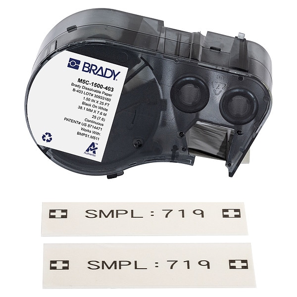 Combined Label and Ribbon Cartridge, Compatible Grainger Part Number 21U174, 21U176, 21U177, 21U178, 21U179, 21U180, 810HX3, 810HX4, Compatible Mfr Part Number BMP51, BMP53, M511, Label Color White, Label Finish Matte, Label Height Not Applicable, Label Material Paper, Label Width 1 1/2 in, Material Properties Water Dissolvable, Printer Series Compatibility BMP51, BMP53, M510, M511, Ribbon Color Black, Roll Length 25 ft, Vial/Tube Size Not Applicable, For Print Method Thermal-Transfer