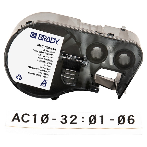 Combined Label and Ribbon Cartridge, Compatible Grainger Part Number 20XX01, 20XX02, 20XX04, 21U174, 21U176, 21U177, 21U178, 21U179, 21U180, 29YJ26, 810HX3, 810HX4, Compatible Mfr Part Number BMP41, BMP51, M511, M511-KIT, Label Color White, Label Finish Matte, Label Height Not Applicable, Label Material Polyester, Label Width 1/2 in, Printer Series Compatibility BMP41, BMP51, BMP53, M410, M510, M511, Ribbon Color Black, Roll Length 12 ft, Vial/Tube Size Not Applicable