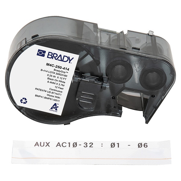 Combined Label and Ribbon Cartridge, Compatible Grainger Part Number 20XX01, 20XX02, 20XX04, 21U174, 21U176, 21U177, 21U178, 21U179, 21U180, 29YJ26, 810HX3, 810HX4, Compatible Mfr Part Number BMP41, BMP51, M511, M511-KIT, Label Color White, Label Finish Matte, Label Height Not Applicable, Label Material Polyester, Label Width 1/4 in, Printer Series Compatibility BMP41, BMP51, BMP53, M410, M510, M511, Ribbon Color Black, Roll Length 12 ft, Vial/Tube Size Not Applicable