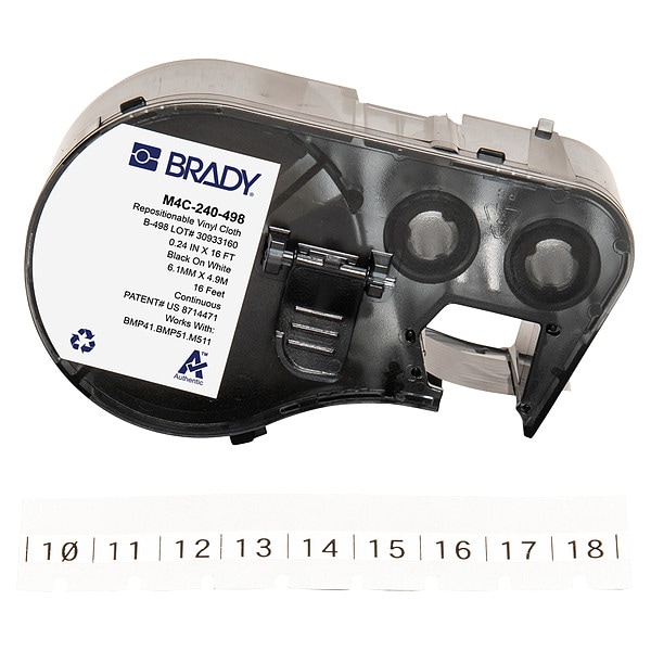 Combined Label and Ribbon Cartridge, Compatible Grainger Part Number 20XX01, 20XX02, 20XX04, 21U174, 21U176, 21U177, 21U178, 21U179, 21U180, 29YJ26, 810HX3, 810HX4, Compatible Mfr Part Number BMP41, BMP51, BMP53, M511, Label Color White, Label Finish Semi-Gloss, Label Height Not Applicable, Label Material Vinyl Cloth, Label Width 15/64 in, Material Properties Not Applicable, Printer Series Compatibility BMP41, BMP51, BMP53, M410, M510, M511, Ribbon Color Black, Roll Length 16 ft
