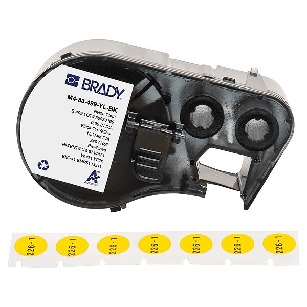 Combined Label and Ribbon Cartridge, Compatible Grainger Part Number 20XX01, 20XX02, 20XX04, 21U174, 21U176, 21U177, 21U178, 21U179, 21U180, 29YJ26, 810HX3, 810HX4, Compatible Mfr Part Number BMP41, BMP51, BMP53, M511, Label Color Yellow, Label Finish Matte, Label Height Not Applicable, Label Material Nylon, Label Width 1/2 in, Material Properties Autoclavable, Cryogenic, Halogen-Free, Printer Series Compatibility BMP41, BMP51, BMP53, M410, M510, M511, Ribbon Color Black