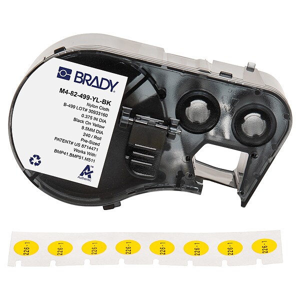 Combined Label and Ribbon Cartridge, Compatible Grainger Part Number 20XX01, 20XX02, 20XX04, 21U174, 21U176, 21U177, 21U178, 21U179, 21U180, 29YJ26, 810HX3, 810HX4, Compatible Mfr Part Number BMP41, BMP51, BMP53, M511, Label Color Yellow, Label Finish Matte, Label Height Not Applicable, Label Material Nylon, Label Width 3/8 in, Material Properties Autoclavable, Cryogenic, Halogen-Free, Printer Series Compatibility BMP41, BMP51, BMP53, M410, M510, M511, Ribbon Color Black