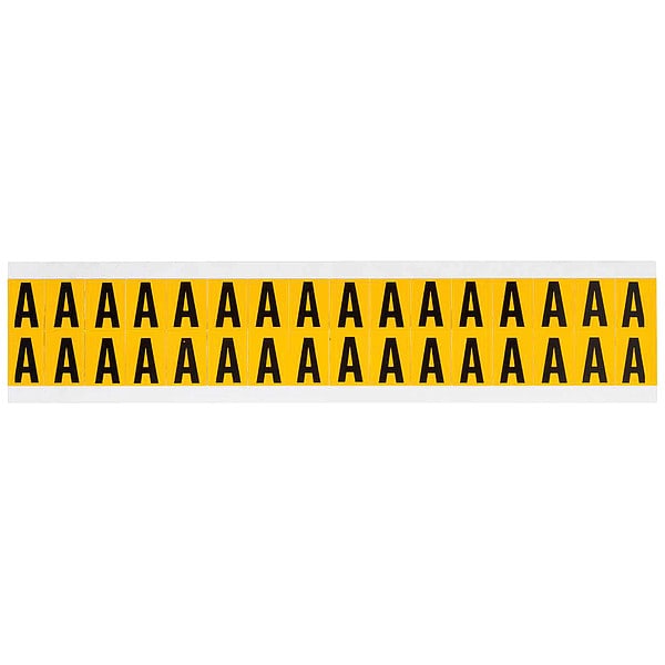 Letter Label, Adhesive Type Permanent Adhesive, Application General Identification, Pipe and Valve Marking, APWA Compliant Color No, Background Color Yellow, Character Color Black, Character Color Gradient Solid Color, Character Height 5/8 in, Character Outline Color Not Applicable, Character Type Letters, Characters Included A, Die Cut Yes, Embossed No, Font Gothic, Includes (32) Labels, Indoor/Outdoor Usage Indoor/Outdoor, Letter Casing Uppercase, Material Vinyl