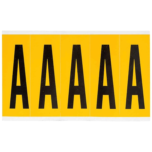 Letter Label, Adhesive Type Permanent Adhesive, Application General Identification, Pipe and Valve Marking, APWA Compliant Color No, Background Color Yellow, Character Color Black, Character Color Gradient Solid Color, Character Height 3 7/8 in, Character Outline Color Not Applicable, Character Type Letters, Characters Included A, Die Cut Yes, Embossed No, Font Gothic, Includes (5) Labels, Indoor/Outdoor Usage Indoor/Outdoor, Letter Casing Uppercase, Material Vinyl
