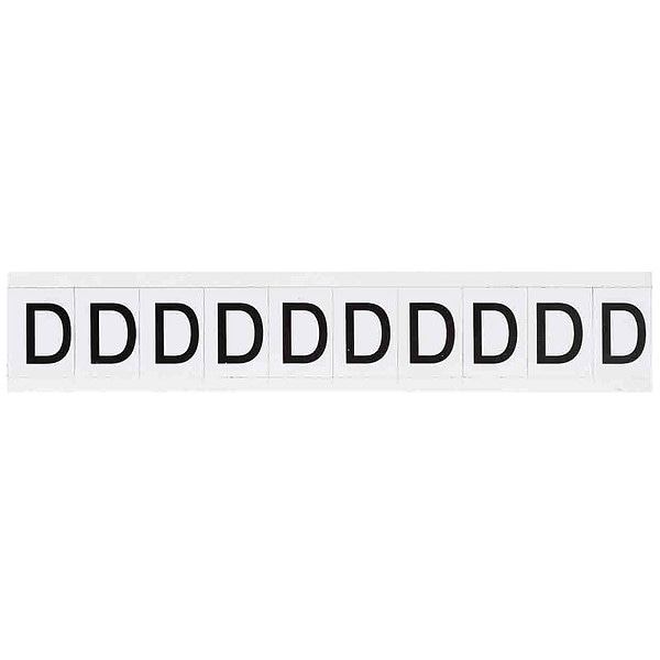 Letter Label, Adhesive Type Permanent Adhesive, Application General Identification, Pipe and Valve Marking, APWA Compliant Color No, Background Color White, Character Color Black, Character Color Gradient Solid Color, Character Height 1 in, Character Outline Color Not Applicable, Character Type Letters, Characters Included D, Die Cut Yes, Embossed No, Font Helvetica, Includes (10) Labels, Indoor/Outdoor Usage Indoor/Outdoor, Letter Casing Uppercase, Material Vinyl