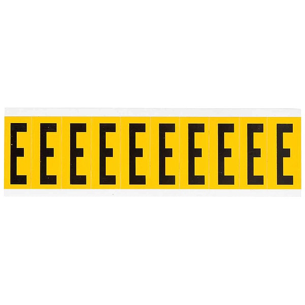 Letter Label, Adhesive Type Permanent Adhesive, Application General Identification, Pipe and Valve Marking, APWA Compliant Color No, Background Color Yellow, Character Color Black, Character Color Gradient Solid Color, Character Height 1 15/16 in, Character Outline Color Not Applicable, Character Type Letters, Characters Included E, Die Cut Yes, Embossed No, Font Gothic, Includes (10) Labels, Indoor/Outdoor Usage Indoor/Outdoor, Letter Casing Uppercase, Material Vinyl