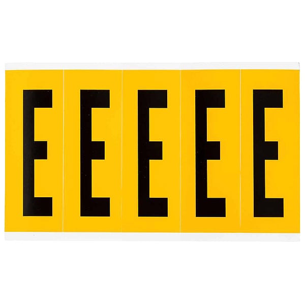 Letter Label, Adhesive Type Permanent Adhesive, Application General Identification, Pipe and Valve Marking, APWA Compliant Color No, Background Color Yellow, Character Color Black, Character Color Gradient Solid Color, Character Height 3 7/8 in, Character Outline Color Not Applicable, Character Type Letters, Characters Included E, Die Cut Yes, Embossed No, Font Gothic, Includes (5) Labels, Indoor/Outdoor Usage Indoor/Outdoor, Letter Casing Uppercase, Material Vinyl