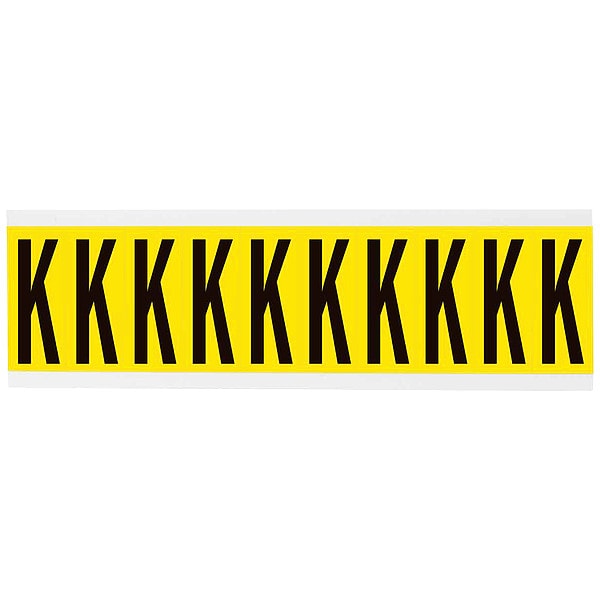 Letter Label, Adhesive Type Removable and Repositionable Adhesive, Application General Identification, Wire and Cable Labeling, APWA Compliant Color No, Background Color Yellow, Character Color Black, Character Color Gradient Solid Color, Character Height 2 in, Character Outline Color Not Applicable, Character Type Letters, Characters Included K, Die Cut Yes, Embossed No, Font Gothic, Includes (10) Labels, Indoor/Outdoor Usage Indoor Only, Letter Casing Uppercase, Material Vinyl Cloth