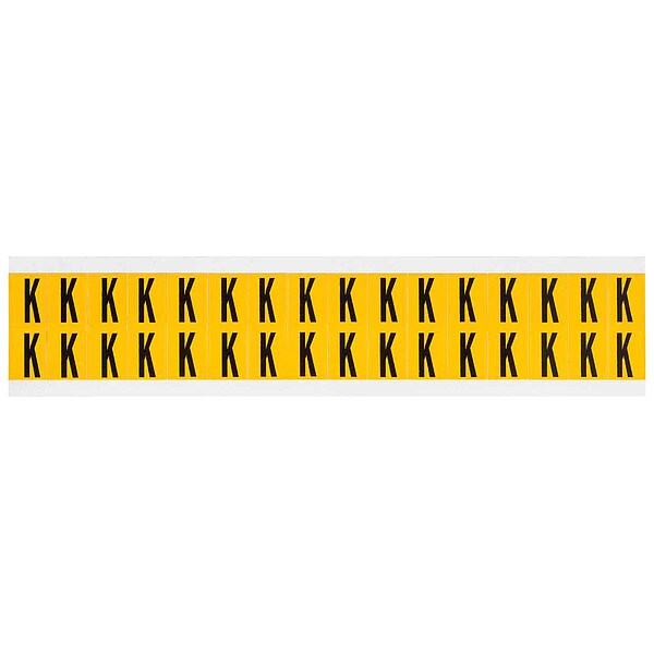 Letter Label, Adhesive Type Permanent Adhesive, Application General Identification, Pipe and Valve Marking, APWA Compliant Color No, Background Color Yellow, Character Color Black, Character Color Gradient Solid Color, Character Height 5/8 in, Character Outline Color Not Applicable, Character Type Letters, Characters Included K, Die Cut Yes, Embossed No, Font Gothic, Includes (32) Labels, Indoor/Outdoor Usage Indoor/Outdoor, Letter Casing Uppercase, Material Vinyl