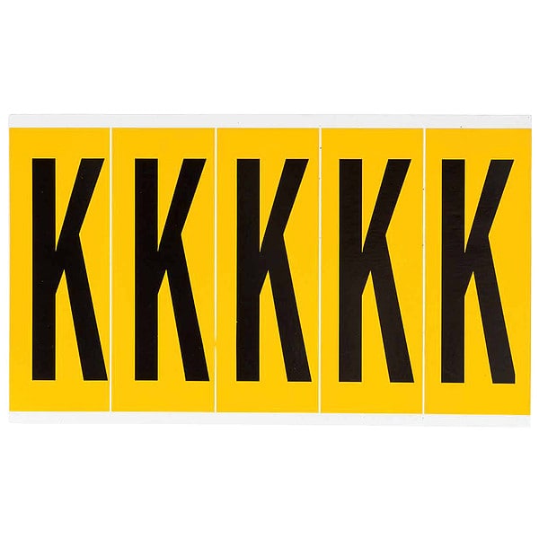 Letter Label, Adhesive Type Permanent Adhesive, Application General Identification, Pipe and Valve Marking, APWA Compliant Color No, Background Color Yellow, Character Color Black, Character Color Gradient Solid Color, Character Height 3 7/8 in, Character Outline Color Not Applicable, Character Type Letters, Characters Included K, Die Cut Yes, Embossed No, Font Gothic, Includes (5) Labels, Indoor/Outdoor Usage Indoor/Outdoor, Letter Casing Uppercase, Material Vinyl