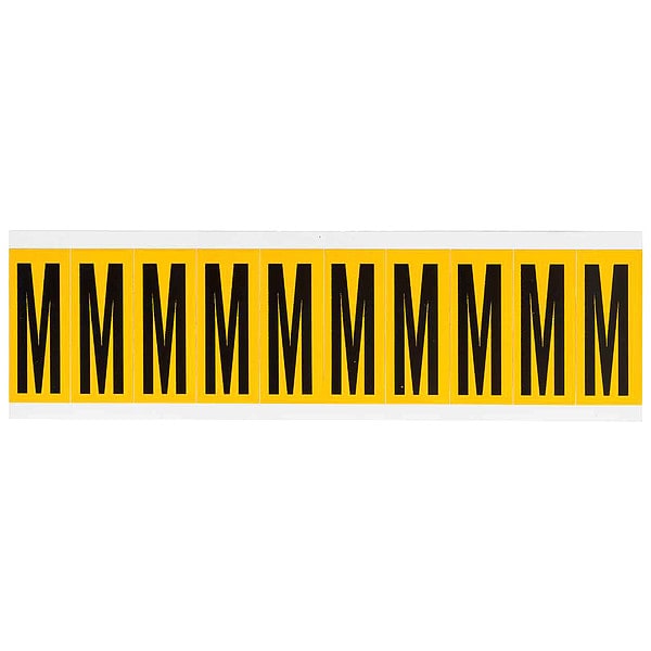 Letter Label, Adhesive Type Permanent Adhesive, Application General Identification, Pipe and Valve Marking, APWA Compliant Color No, Background Color Yellow, Character Color Black, Character Color Gradient Solid Color, Character Height 1 15/16 in, Character Outline Color Not Applicable, Character Type Letters, Characters Included M, Die Cut Yes, Embossed No, Font Gothic, Includes (10) Labels, Indoor/Outdoor Usage Indoor/Outdoor, Letter Casing Uppercase, Material Vinyl
