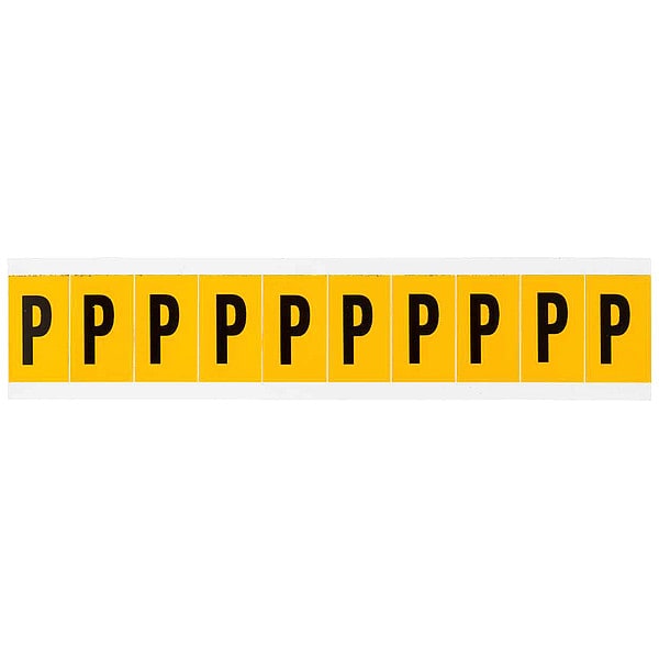 Letter Label, Adhesive Type Permanent Adhesive, Application General Identification, Pipe and Valve Marking, APWA Compliant Color No, Background Color Yellow, Character Color Black, Character Color Gradient Solid Color, Character Height 1 in, Character Outline Color Not Applicable, Character Type Letters, Characters Included P, Die Cut Yes, Embossed No, Font Gothic, Includes (10) Labels, Indoor/Outdoor Usage Indoor/Outdoor, Letter Casing Uppercase, Material Vinyl