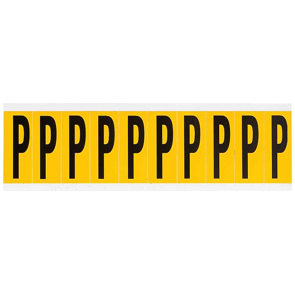 Letter Label, Adhesive Type Permanent Adhesive, Application General Identification, Pipe and Valve Marking, APWA Compliant Color No, Background Color Yellow, Character Color Black, Character Color Gradient Solid Color, Character Height 1 15/16 in, Character Outline Color Not Applicable, Character Type Letters, Characters Included P, Die Cut Yes, Embossed No, Font Gothic, Includes (10) Labels, Indoor/Outdoor Usage Indoor/Outdoor, Letter Casing Uppercase, Material Vinyl