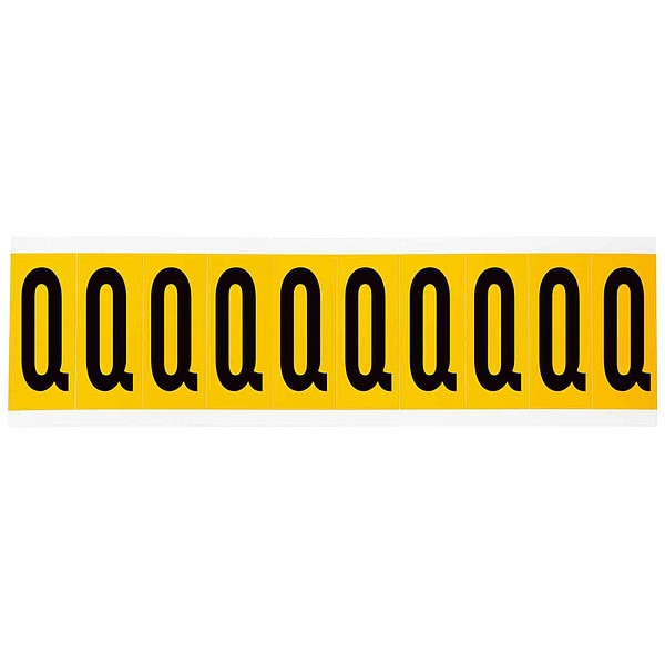 Letter Label, Adhesive Type Permanent Adhesive, Application General Identification, Pipe and Valve Marking, APWA Compliant Color No, Background Color Yellow, Character Color Black, Character Color Gradient Solid Color, Character Height 1 15/16 in, Character Outline Color Not Applicable, Character Type Letters, Characters Included Q, Die Cut Yes, Embossed No, Font Gothic, Includes (10) Labels, Indoor/Outdoor Usage Indoor/Outdoor, Letter Casing Uppercase, Material Vinyl
