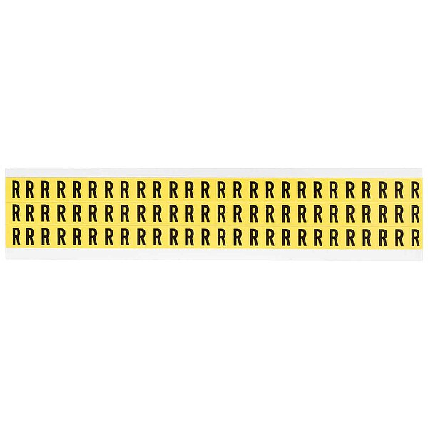 Letter Label, Adhesive Type Removable and Repositionable Adhesive, Application General Identification, Wire and Cable Labeling, APWA Compliant Color No, Background Color Yellow, Character Color Black, Character Color Gradient Solid Color, Character Height 3/8 in, Character Outline Color Not Applicable, Character Type Letters, Characters Included R, Die Cut Yes, Embossed No, Font Gothic, Includes (78) Labels, Indoor/Outdoor Usage Indoor Only, Letter Casing Uppercase, Material Vinyl Cloth
