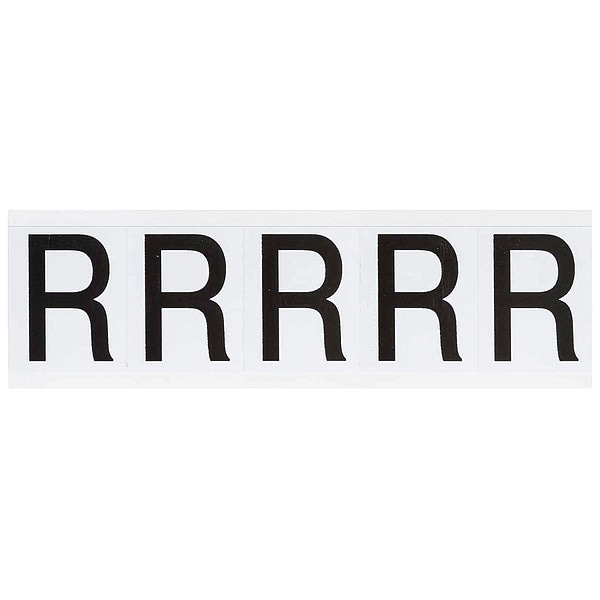 Letter Label, Adhesive Type Permanent Adhesive, Application General Identification, Pipe and Valve Marking, APWA Compliant Color No, Background Color White, Character Color Black, Character Color Gradient Solid Color, Character Height 2 in, Character Outline Color Not Applicable, Character Type Letters, Characters Included R, Die Cut Yes, Embossed No, Font Helvetica, Includes (5) Labels, Indoor/Outdoor Usage Indoor/Outdoor, Letter Casing Uppercase, Material Vinyl