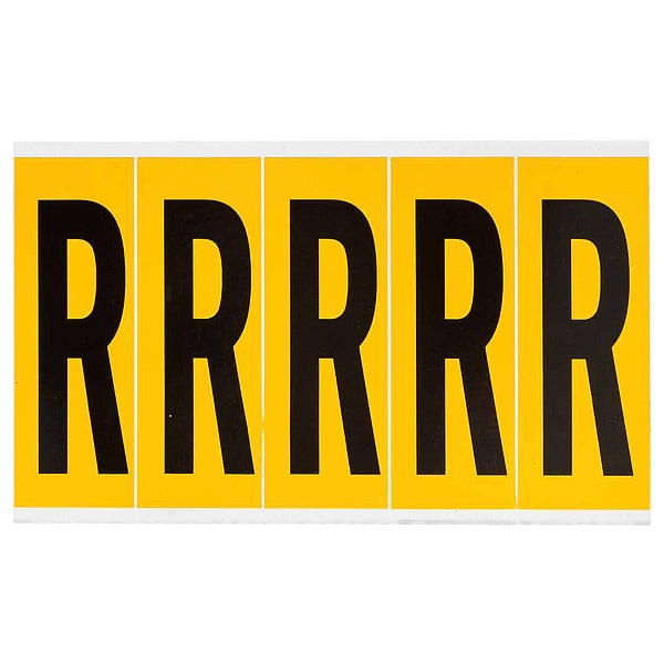 Letter Label, Adhesive Type Permanent Adhesive, Application General Identification, Pipe and Valve Marking, APWA Compliant Color No, Background Color Yellow, Character Color Black, Character Color Gradient Solid Color, Character Height 3 7/8 in, Character Outline Color Not Applicable, Character Type Letters, Characters Included R, Die Cut Yes, Embossed No, Font Gothic, Includes (5) Labels, Indoor/Outdoor Usage Indoor/Outdoor, Letter Casing Uppercase, Material Vinyl