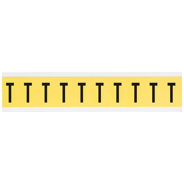 Letter Label, Adhesive Type Removable and Repositionable Adhesive, Application General Identification, Wire and Cable Labeling, APWA Compliant Color No, Background Color Yellow, Character Color Black, Character Color Gradient Solid Color, Character Height 1 in, Character Outline Color Not Applicable, Character Type Letters, Characters Included T, Die Cut Yes, Embossed No, Font Gothic, Includes (10) Labels, Indoor/Outdoor Usage Indoor Only, Letter Casing Uppercase, Material Vinyl Cloth