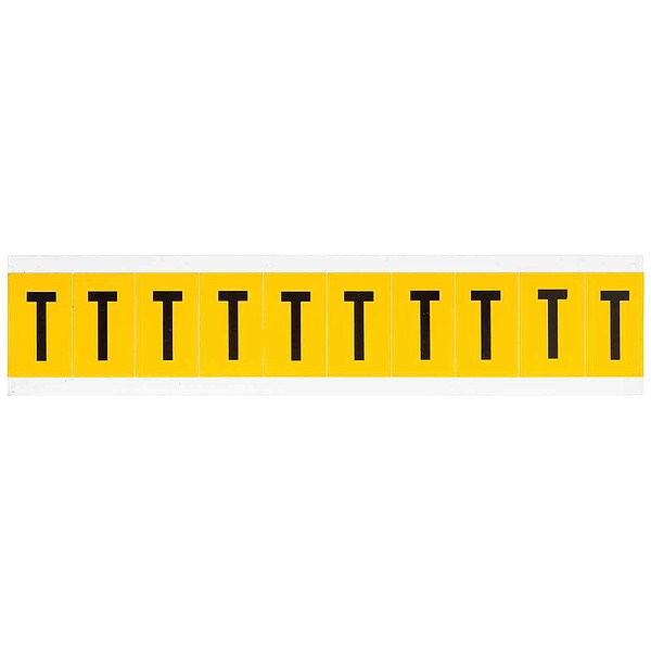 Letter Label, Adhesive Type Permanent Adhesive, Application General Identification, Pipe and Valve Marking, APWA Compliant Color No, Background Color Yellow, Character Color Black, Character Color Gradient Solid Color, Character Height 1 in, Character Outline Color Not Applicable, Character Type Letters, Characters Included T, Die Cut Yes, Embossed No, Font Gothic, Includes (10) Labels, Indoor/Outdoor Usage Indoor/Outdoor, Letter Casing Uppercase, Material Vinyl