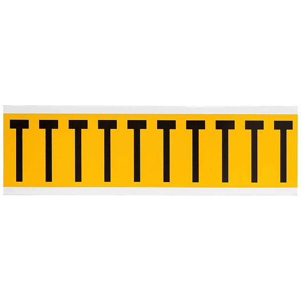 Letter Label, Adhesive Type Permanent Adhesive, Application General Identification, Pipe and Valve Marking, APWA Compliant Color No, Background Color Yellow, Character Color Black, Character Color Gradient Solid Color, Character Height 1 15/16 in, Character Outline Color Not Applicable, Character Type Letters, Characters Included T, Die Cut Yes, Embossed No, Font Gothic, Includes (10) Labels, Indoor/Outdoor Usage Indoor/Outdoor, Letter Casing Uppercase, Material Vinyl