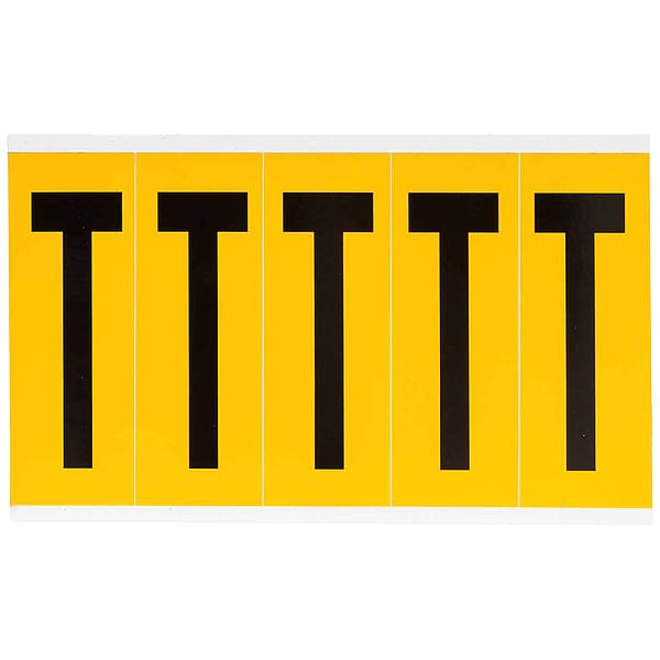 Letter Label, Adhesive Type Permanent Adhesive, Application General Identification, Pipe and Valve Marking, APWA Compliant Color No, Background Color Yellow, Character Color Black, Character Color Gradient Solid Color, Character Height 3 7/8 in, Character Outline Color Not Applicable, Character Type Letters, Characters Included T, Die Cut Yes, Embossed No, Font Gothic, Includes (5) Labels, Indoor/Outdoor Usage Indoor/Outdoor, Letter Casing Uppercase, Material Vinyl
