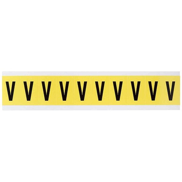 Letter Label, Adhesive Type Removable and Repositionable Adhesive, Application General Identification, Wire and Cable Labeling, APWA Compliant Color No, Background Color Yellow, Character Color Black, Character Color Gradient Solid Color, Character Height 1 in, Character Outline Color Not Applicable, Character Type Letters, Characters Included V, Die Cut Yes, Embossed No, Font Gothic, Includes (10) Labels, Indoor/Outdoor Usage Indoor Only, Letter Casing Uppercase, Material Vinyl Cloth
