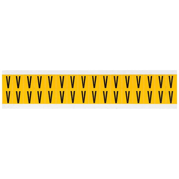 Letter Label, Adhesive Type Permanent Adhesive, Application General Identification, Pipe and Valve Marking, APWA Compliant Color No, Background Color Yellow, Character Color Black, Character Color Gradient Solid Color, Character Height 5/8 in, Character Outline Color Not Applicable, Character Type Letters, Characters Included V, Die Cut Yes, Embossed No, Font Gothic, Includes (32) Labels, Indoor/Outdoor Usage Indoor/Outdoor, Letter Casing Uppercase, Material Vinyl