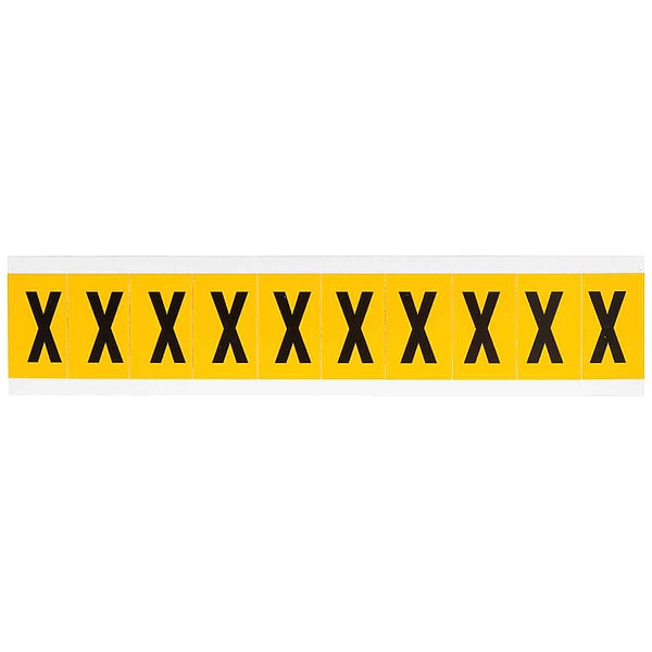 Letter Label, Adhesive Type Permanent Adhesive, Application General Identification, Pipe and Valve Marking, APWA Compliant Color No, Background Color Yellow, Character Color Black, Character Color Gradient Solid Color, Character Height 1 in, Character Outline Color Not Applicable, Character Type Letters, Characters Included X, Die Cut Yes, Embossed No, Font Gothic, Includes (10) Labels, Indoor/Outdoor Usage Indoor/Outdoor, Letter Casing Uppercase, Material Vinyl