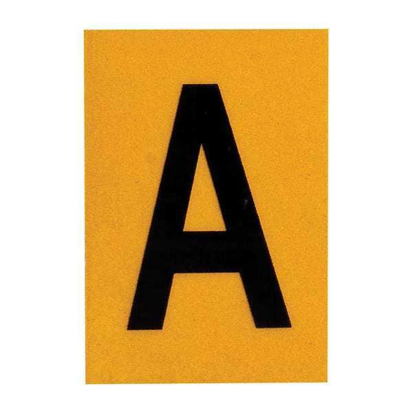 Letter Label, Adhesive Type Permanent Adhesive, Application Utility Plant Markings, APWA Compliant Color No, Background Color Yellow, Character Color Black, Character Color Gradient Solid Color, Character Height 1 in, Character Outline Color Not Applicable, Character Type Letters, Characters Included A, Die Cut Yes, Embossed No, Font Gothic, Includes (25) Cards, Indoor/Outdoor Usage Indoor/Outdoor, Letter Casing Uppercase, Material Retroreflective Sheeting, Meets USCG Registration Guidelines No