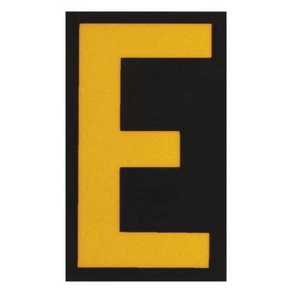 Letter Label, Adhesive Type Permanent Adhesive, Application Utility Plant Markings, APWA Compliant Color No, Background Color Black, Character Color Yellow, Character Color Gradient Solid Color, Character Height 2 1/2 in, Character Outline Color Not Applicable, Character Type Letters, Characters Included E, Die Cut Yes, Embossed No, Font Archivo Narrow, Includes (25) Labels, Indoor/Outdoor Usage Indoor/Outdoor, Letter Casing Uppercase, Material Retroreflective Sheeting