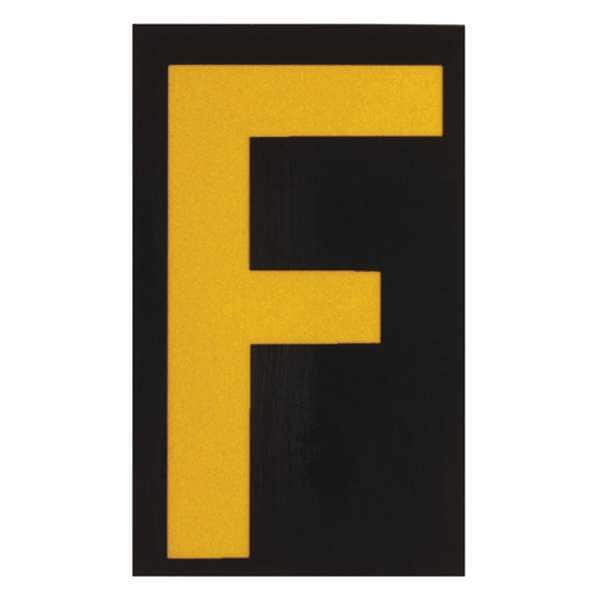 Letter Label, Adhesive Type Permanent Adhesive, Application Utility Plant Markings, APWA Compliant Color No, Background Color Black, Character Color Yellow, Character Color Gradient Solid Color, Character Height 2 1/2 in, Character Outline Color Not Applicable, Character Type Letters, Characters Included F, Die Cut Yes, Embossed No, Font Archivo Narrow, Includes (25) Labels, Indoor/Outdoor Usage Indoor/Outdoor, Letter Casing Uppercase, Material Retroreflective Sheeting