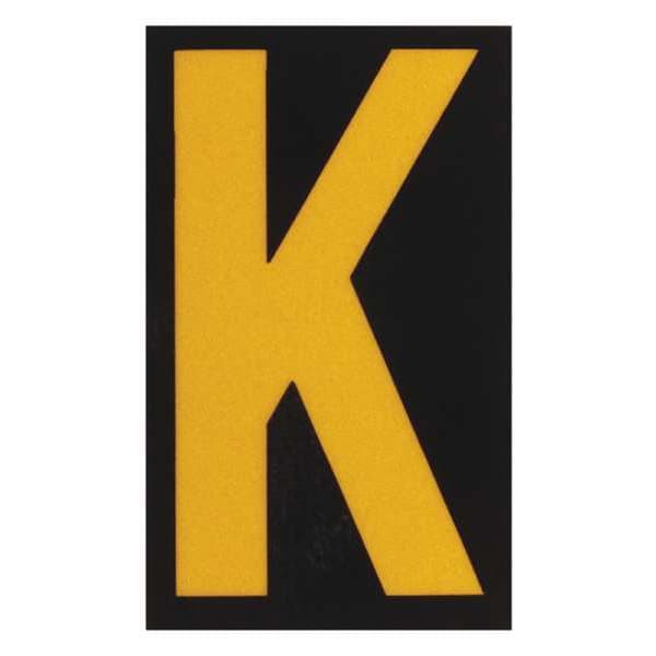 Letter Label, Adhesive Type Permanent Adhesive, Application Utility Plant Markings, APWA Compliant Color No, Background Color Black, Character Color Yellow, Character Color Gradient Solid Color, Character Height 2 1/2 in, Character Outline Color Not Applicable, Character Type Letters, Characters Included K, Die Cut Yes, Embossed No, Font Archivo Narrow, Includes (25) Labels, Indoor/Outdoor Usage Indoor/Outdoor, Letter Casing Uppercase, Material Retroreflective Sheeting