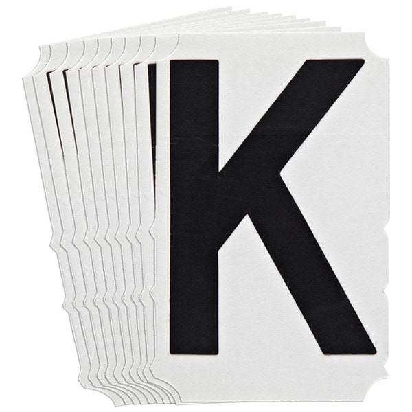 Letter Label, Adhesive Type Permanent Adhesive, Application General Identification, APWA Compliant Color No, Background Color Not Applicable, Character Color Black, Character Color Gradient Solid Color, Character Height 3 in, Character Outline Color Not Applicable, Character Type Letters, Characters Included K, Die Cut Yes, Embossed No, Font Gothic, Includes (10) Labels, Indoor/Outdoor Usage Indoor/Outdoor, Letter Casing Uppercase, Material Polyester, Meets USCG Registration Guidelines No