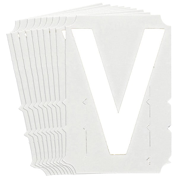 Letter Label, Adhesive Type Permanent Adhesive, Application General Identification, APWA Compliant Color No, Background Color Not Applicable, Character Color White, Character Color Gradient Solid Color, Character Height 4 in, Character Outline Color Not Applicable, Character Type Letters, Characters Included V, Die Cut Yes, Embossed No, Font Gothic, Includes (10) Labels, Indoor/Outdoor Usage Indoor/Outdoor, Letter Casing Uppercase, Material Polyester, Meets USCG Registration Guidelines No