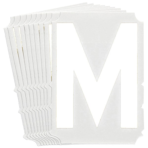 Letter Label, Adhesive Type Permanent Adhesive, Application General Identification, APWA Compliant Color No, Background Color Not Applicable, Character Color White, Character Color Gradient Solid Color, Character Height 4 in, Character Outline Color Not Applicable, Character Type Letters, Characters Included M, Die Cut Yes, Embossed No, Font Gothic, Includes (10) Labels, Indoor/Outdoor Usage Indoor/Outdoor, Letter Casing Uppercase, Material Polyester, Meets USCG Registration Guidelines No