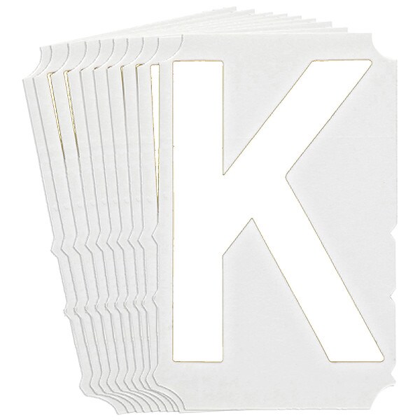 Letter Label, Adhesive Type Permanent Adhesive, Application General Identification, APWA Compliant Color No, Background Color Not Applicable, Character Color White, Character Color Gradient Solid Color, Character Height 6 in, Character Outline Color Not Applicable, Character Type Letters, Characters Included K, Die Cut Yes, Embossed No, Font Gothic, Includes (10) Labels, Indoor/Outdoor Usage Indoor/Outdoor, Letter Casing Uppercase, Material Polyester, Meets USCG Registration Guidelines No